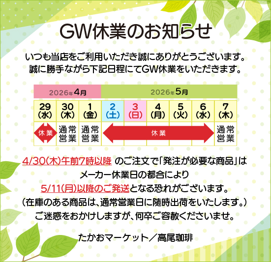 いつも高尾珈琲株式会社をご愛顧いただき誠にありがとうございます。勝手ながら以下の期間、GW休業をいた […]